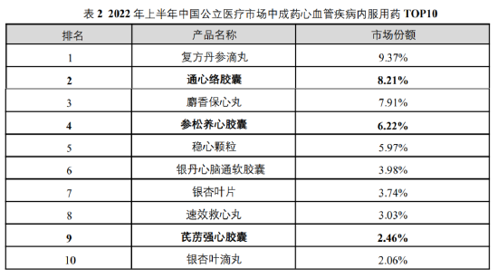 市场层面,“通络三宝”成功得到了患者、医生的普遍认可。据米内网数据显示,从医疗终端产品份额情况看,以岭药业通心络胶囊、参松养心胶囊和芪苈强心胶囊三大专利中药市场份额由2015年的13.64%提升至2022上半年的16.89%。在2022上半年公立医疗市场中成药心血管疾病内服用药排名中,通心络胶囊、参松养心胶囊和芪苈强心胶囊分别排在第2名、第4名和第9名。