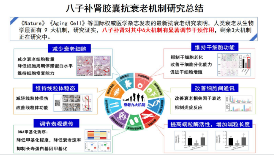 此外,《Nature》《Aging Cel1》等国际权威医学杂志发表的最新抗衰老研究表明,人类衰老从生物学层面有9大机制,通过对这些机制进行治疗干预,可以减缓、停止或逆转衰老。研究证实,八子补肾对其中多个机制有显著调节干预作用,包括减少衰老细胞、维持线粒体稳态、调节表观遗传、维持干细胞功能、改善细胞间通讯、提高端粒酶活性、增加端粒长度。