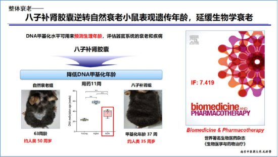 而八子补肾胶囊通过逆转DNA甲基化抗衰老的功效已在科学实验中得到验证,相关学术论文《八子补肾延缓自然衰老小鼠表观遗传衰老并延长其健康寿命》也发表在国际药学领域SCI期刊《生物医学与药物治疗》(Biomedicine&Pharmacotherapy,影响因子7.419)上。