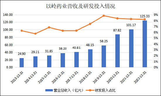 对于生物医药企业而言,创新研发是其核心竞争力的根本来源,是研制出安全有效的治疗药物,惠及广大患者群体的重要保障。以岭药业作为中医药行业的头部企业,主动把握时代发展趋势,践行中医药传承创新发展,常年保持高水平的研发投入。2022年,以岭药业投入研发费用达10.3亿,同比增加30.28%,研发费用占营业收入比例达8.2%,处于同行业领先水平。